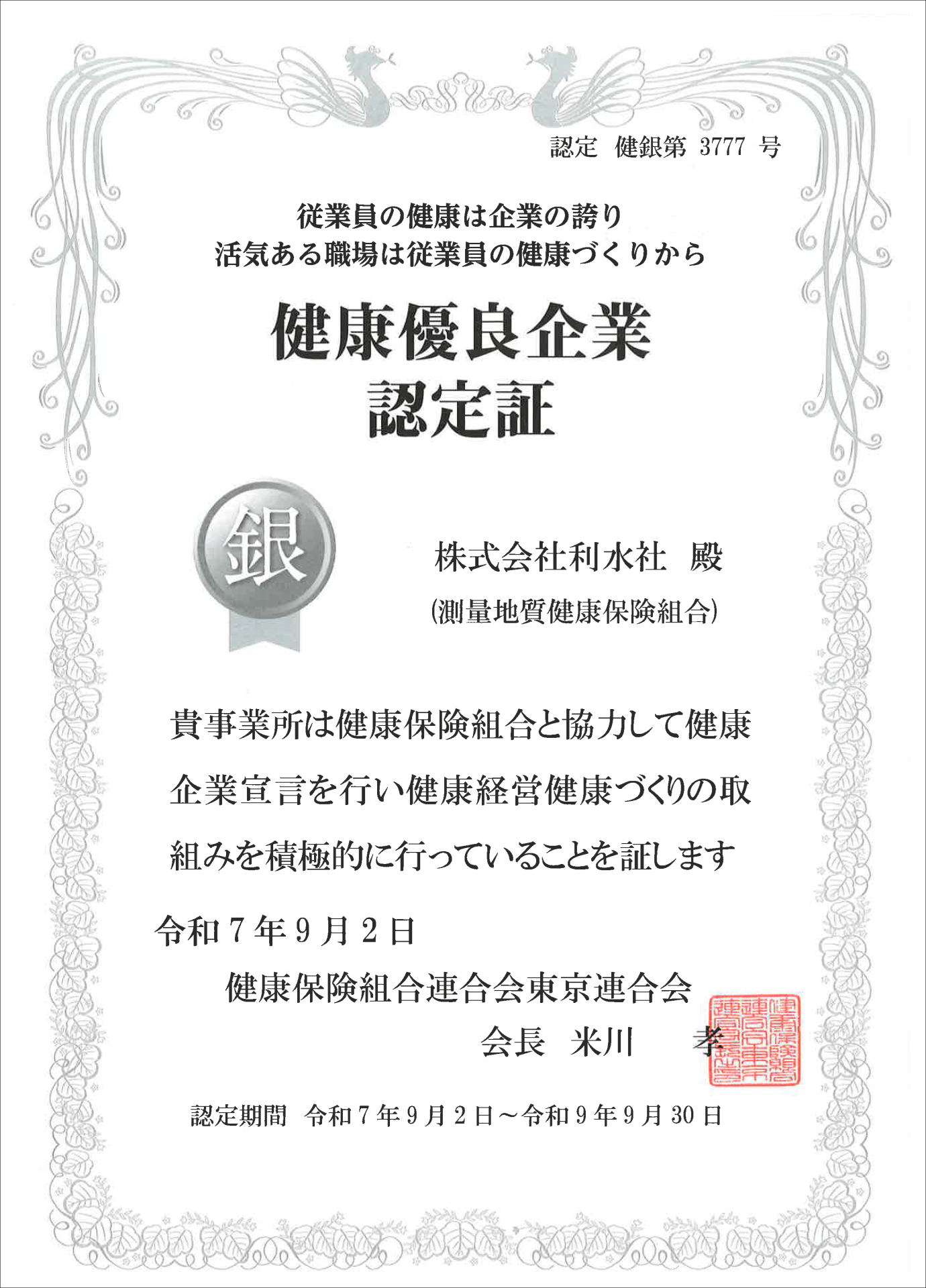 お知らせ news TOP お知らせ 健康優良企業「銀の認定」を取得しました 健康優良企業「銀の認定」を取得しました このたび、「健康優良企業認定制度」において、銀の認定を取得いたしました。 この認定は、企業全体で健康づくりに取り組み、健診結果の活用や運動・食事・禁煙・メンタルヘルスなどの分野で一定の成果を収めた企業に与えられるものです。 今後も、より健やかな職場づくりを目指し、従業員の健康増進に一層取り組んでまいります。